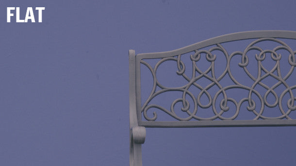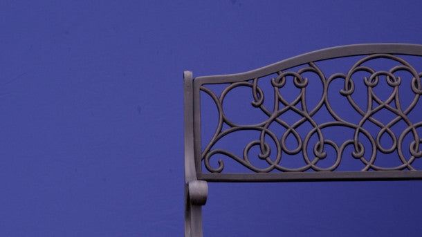 Slightly angled shot of the top right half of a park bench (primarily the backrest and arm).