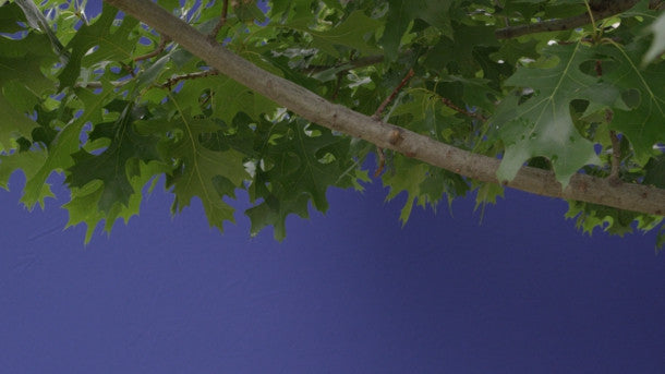 A blowing tree branch from an Oak tree shot over blue screen. View of actual branch with leaves surrounding it. Heavier wind.