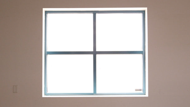 A four pane window with the exposure bracketed closer to the interior light level, letting the outside light blow out.