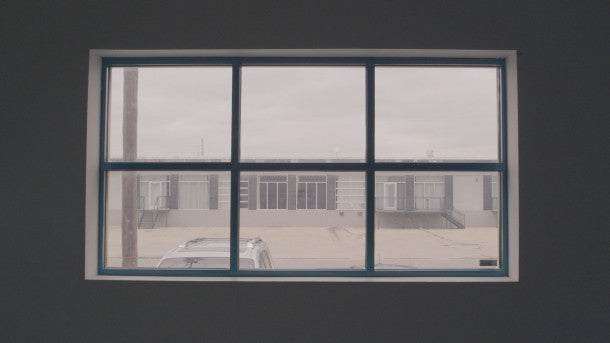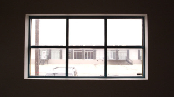 A large six pane window with the exposure bracketed down to show some of the outside. The inside walls and frame are in shadow.