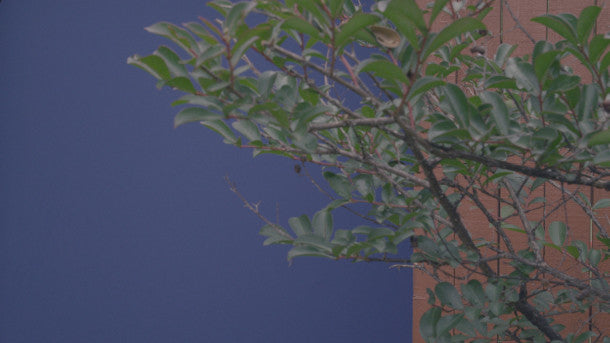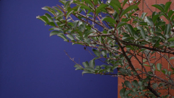 A lightly blowing Crape Myrtle shrub hangs over the edge of a wood fence.
