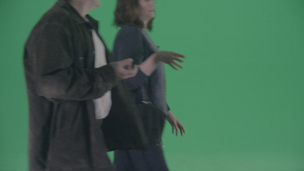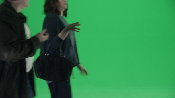 A Caucasian woman and man enter frame together as they walk and talk crossing left to right on green screen.